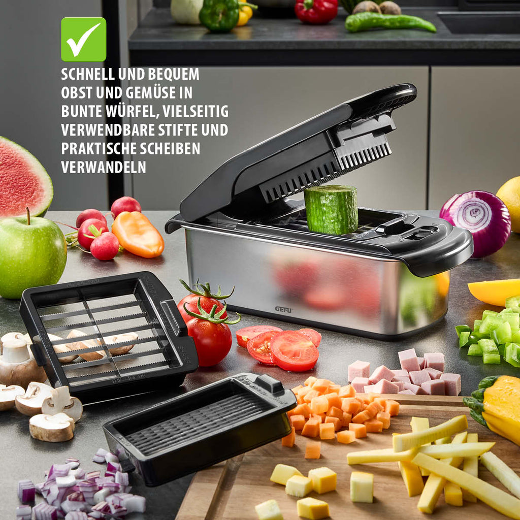 Schneller und bequemer kann man Obst und Gemüse nicht in bunte Würfel, vielseitig verwendbare Stifte und praktische Scheiben verwandeln. Extrascharfe Messereinsätze sorgen für müheloses Schneiden und gleichmäßige Resultate - von fein für gesunde Rohkost oder Suppeneinlagen bis grob für leckere Eintöpfe oder Scheiben für Kartoffelsalate.